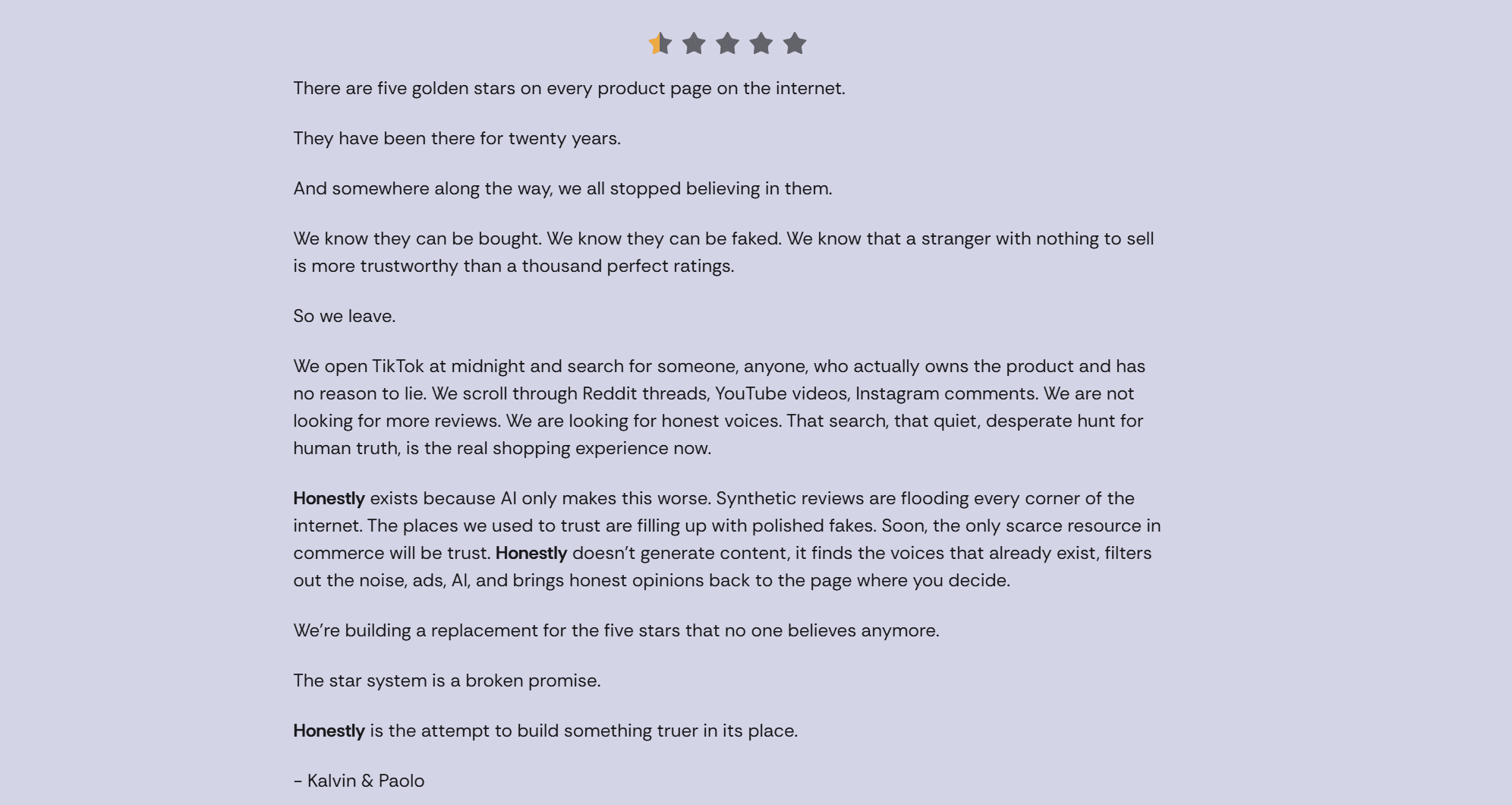 Honestly exists because AI only makes this worse. Synthetic reviews are flooding every corner of the internet. The places we used to trust are filling up with polished fakes. Soon, the only scarce resource in commerce will be trust. Honestly doesn't generate content, it finds the voices that already exist, filters out the noise, ads, AI, and brings honest opinions back to the page where you decide.